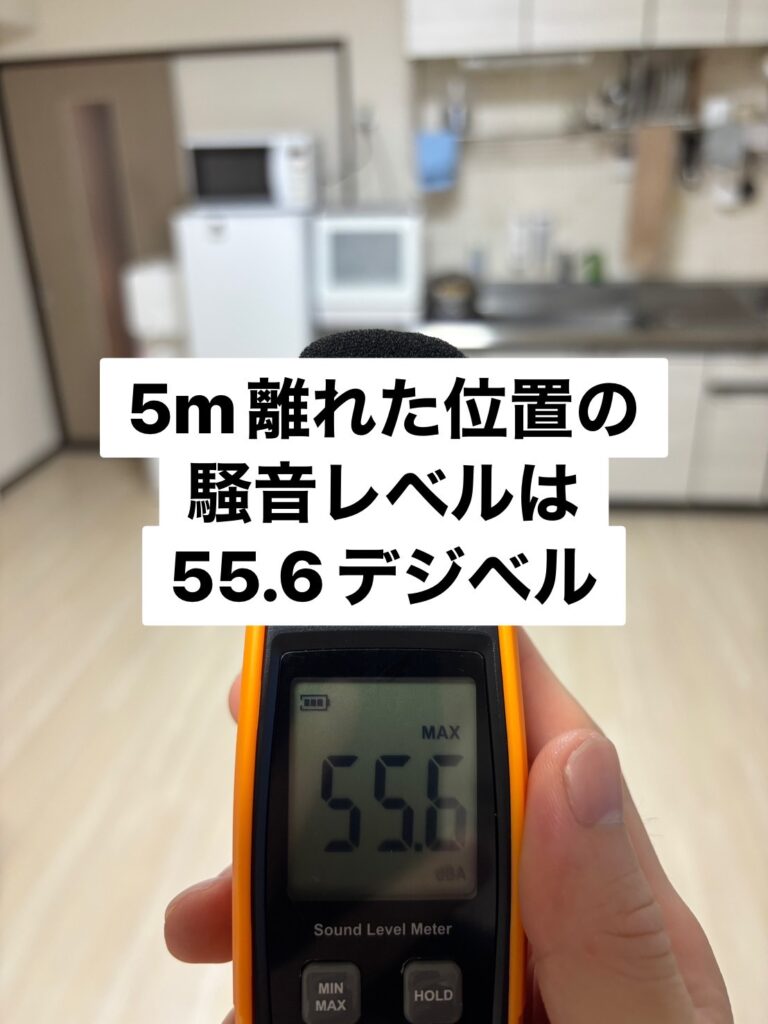 測定結果は距離が1メートルだと57.4デジベル5メートルだと55.6デジベルでした。
